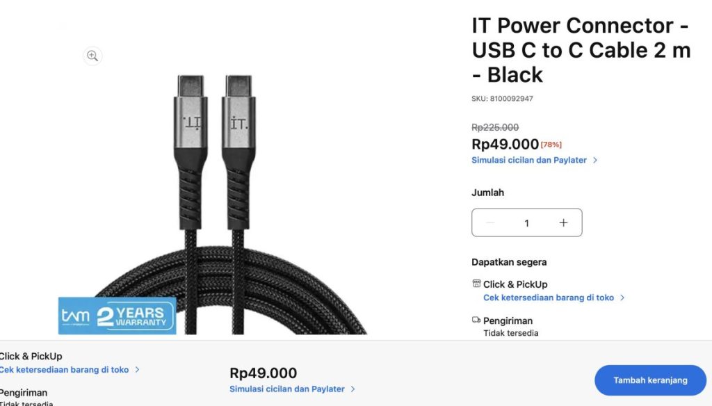 インドネシアのアップル正規プロバイダ「iBox(Gajah Mada Mall店)」で10月1日、USB-Cケーブルを、78%オフの4万9000IDR(450円)で購入しました。